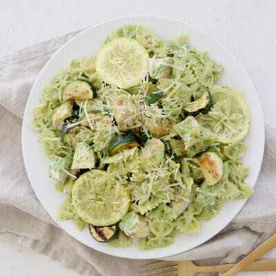 Is there anything better than pesto?! It’s incredible in pasta, on top of your favorite protein and even a yummy dip for veggies. This Lemon Chicken Zucchini Pesto Pasta is sure to be a new family favorite! This pesto is simple to make and the entire recipe is gluten-free and dairy-free. We love making a big batch of this pesto to use throughout the week.