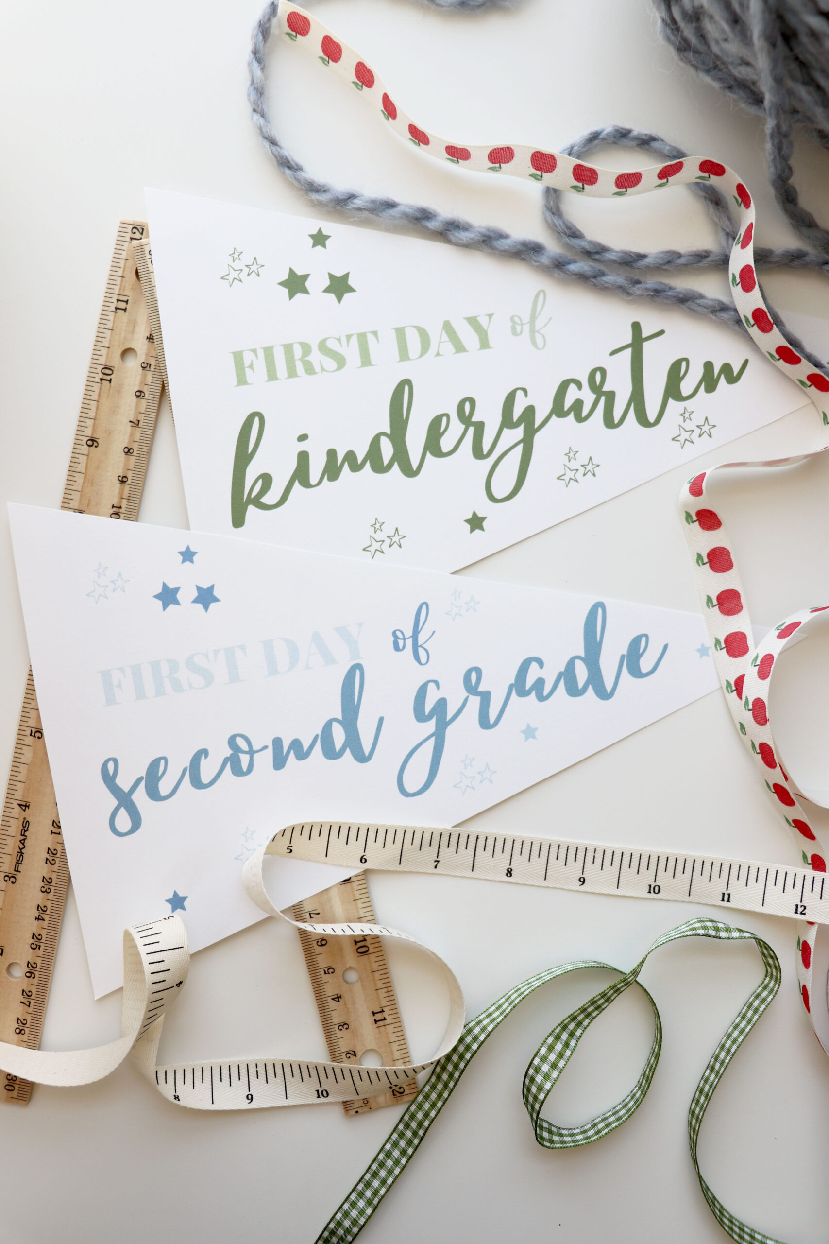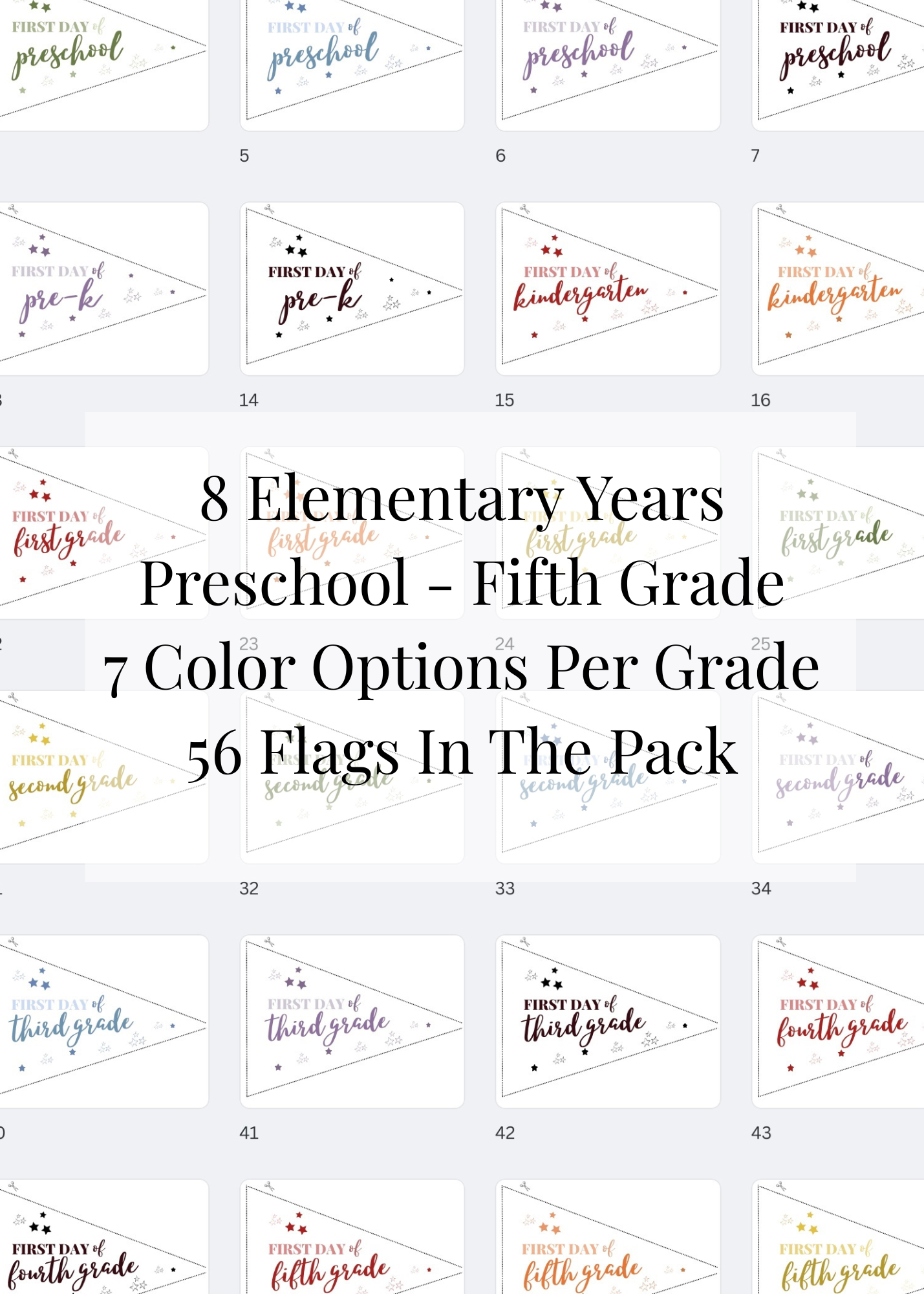 Celebrate the first day of school with these adorable keepsake flags! This pack includes 56 flags to cover all of the elementary school grades from preschool – fifth grade offering 7 different color options per flag!