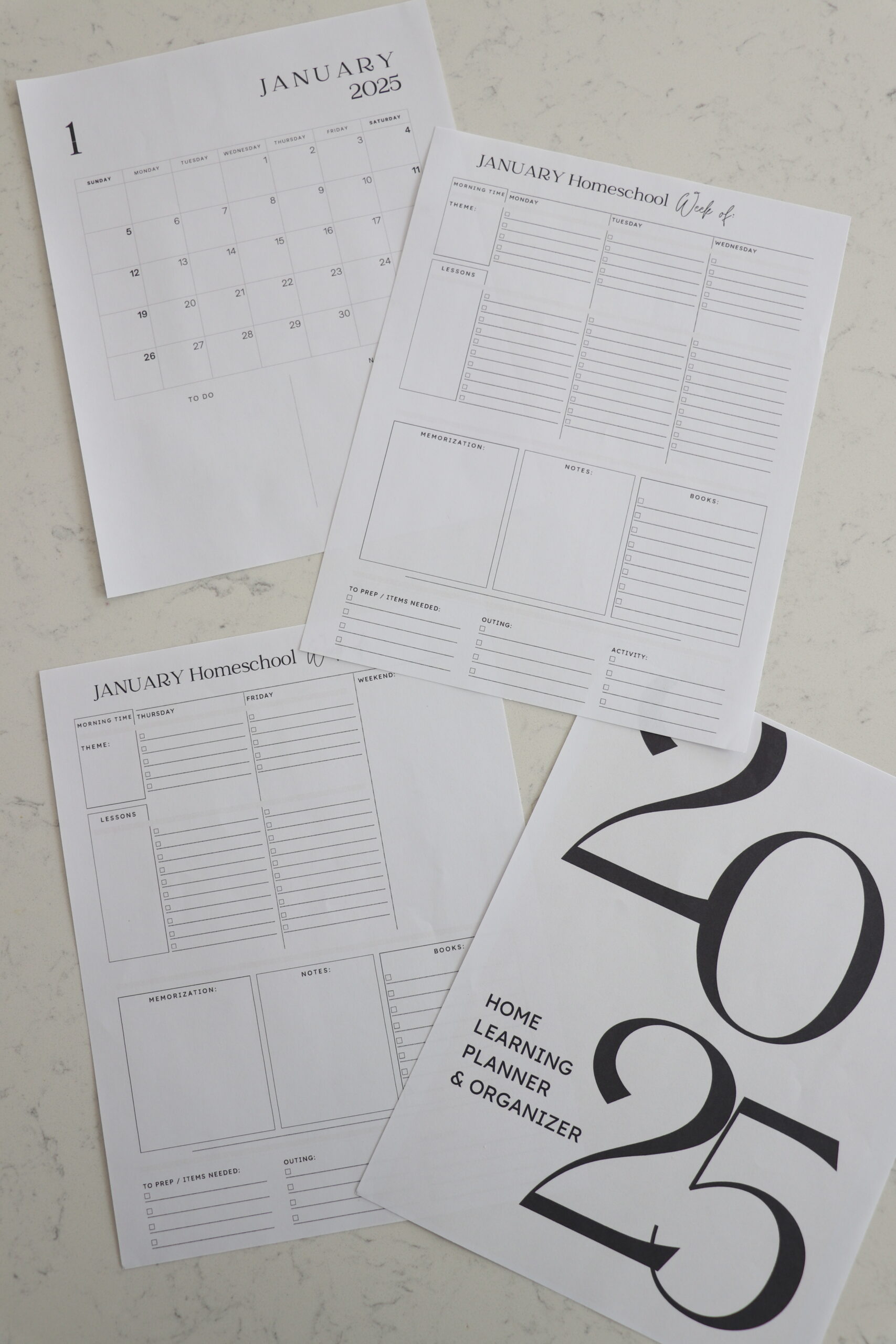 PDF printable homeschool planner for 2025. This 42 page printable planner is a great way to organize and plan for your home learning days. Included are: weekly planners to organize your daily: morning time, lessons, weekly theme, books to read, memorization / verse of the week, items to prep, outings, activities and notes. Please note you’ll need to print out multiple copies of the weekly planners to cover all the weeks in each month. Included is a 2025 calendar to track attendance or see each month and schedule at a glance. Lastly, enjoy the family goals tracker to work on weekly family wellness habits. Wishing you a wonderful and organized 2025!