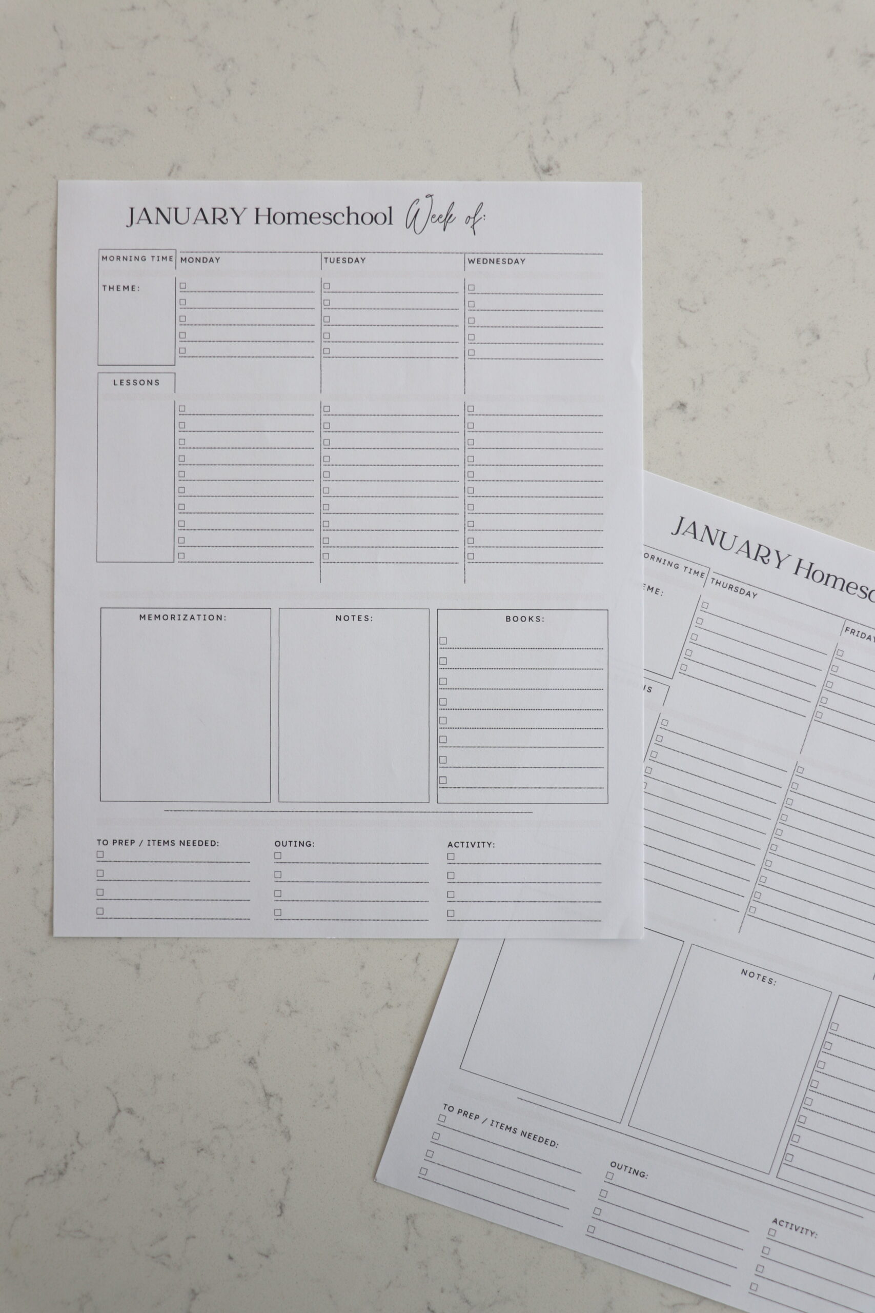 - Weekly planners to organize your daily: morning time, lessons, weekly theme, books to read, memorization / verse of the week, items to prep, outings, activities and notes. Please note you’ll need to print out multiple copies of the weekly planners to cover all the weeks in each month.