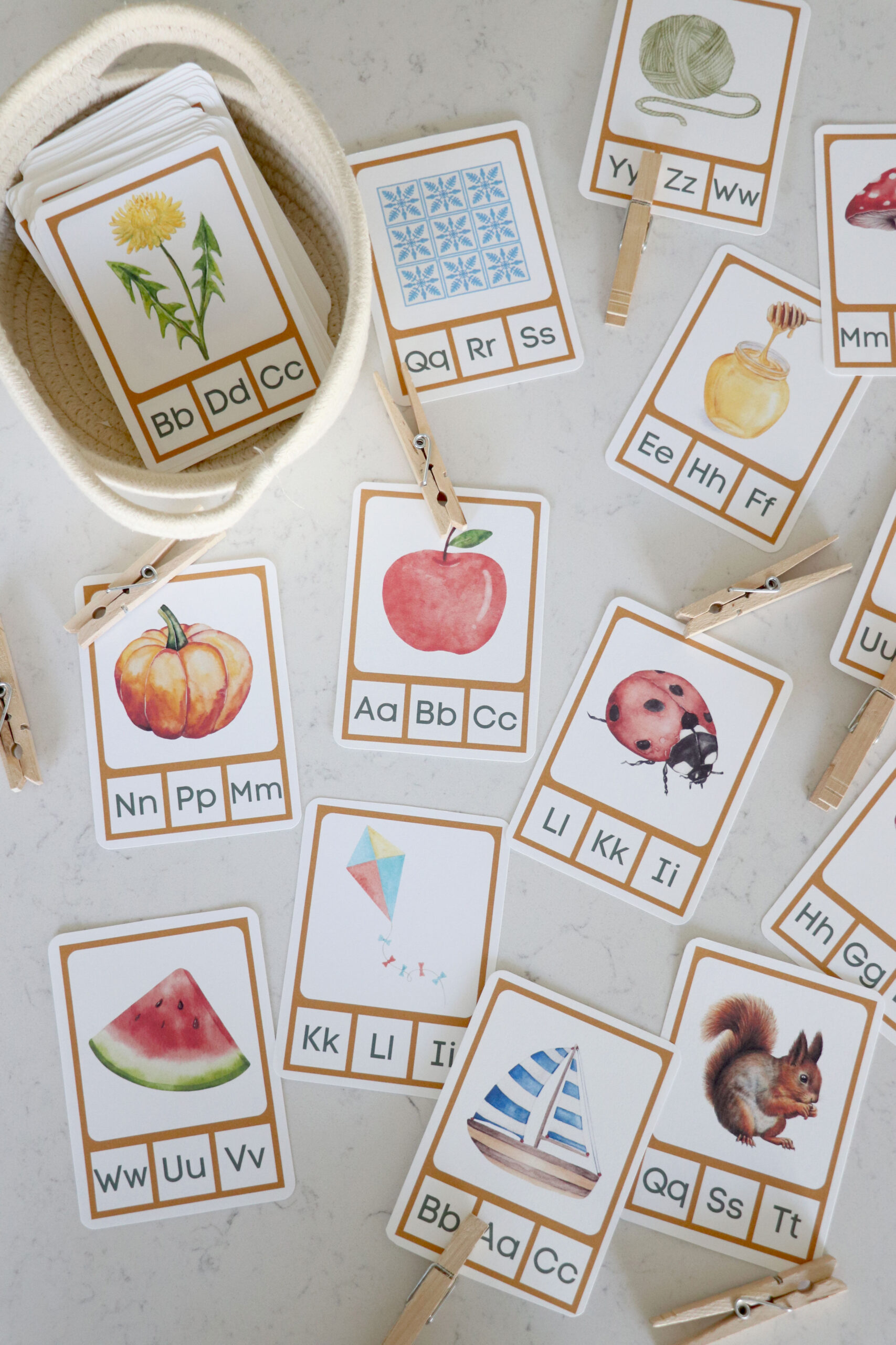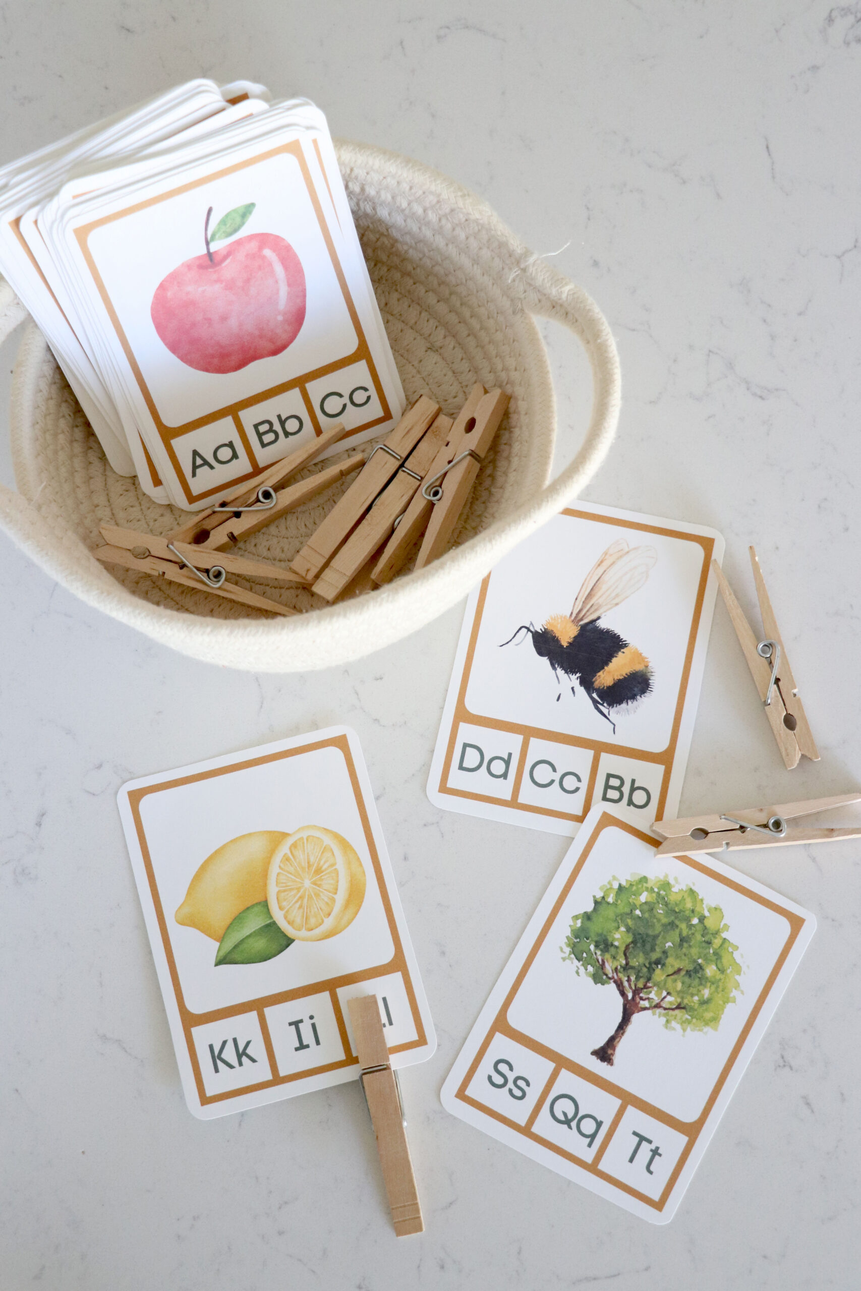 You will need to print and cut out cards. This is the printer I use and love for quality home color printing. I also like to round the edges with this which makes the cards look extra beautiful. Optionally, I like to print these cards on card stock paper such as this one (click to see) to create a sturdy card. You can also laminate for durability and longevity! For clipping I use clothespins, like these!