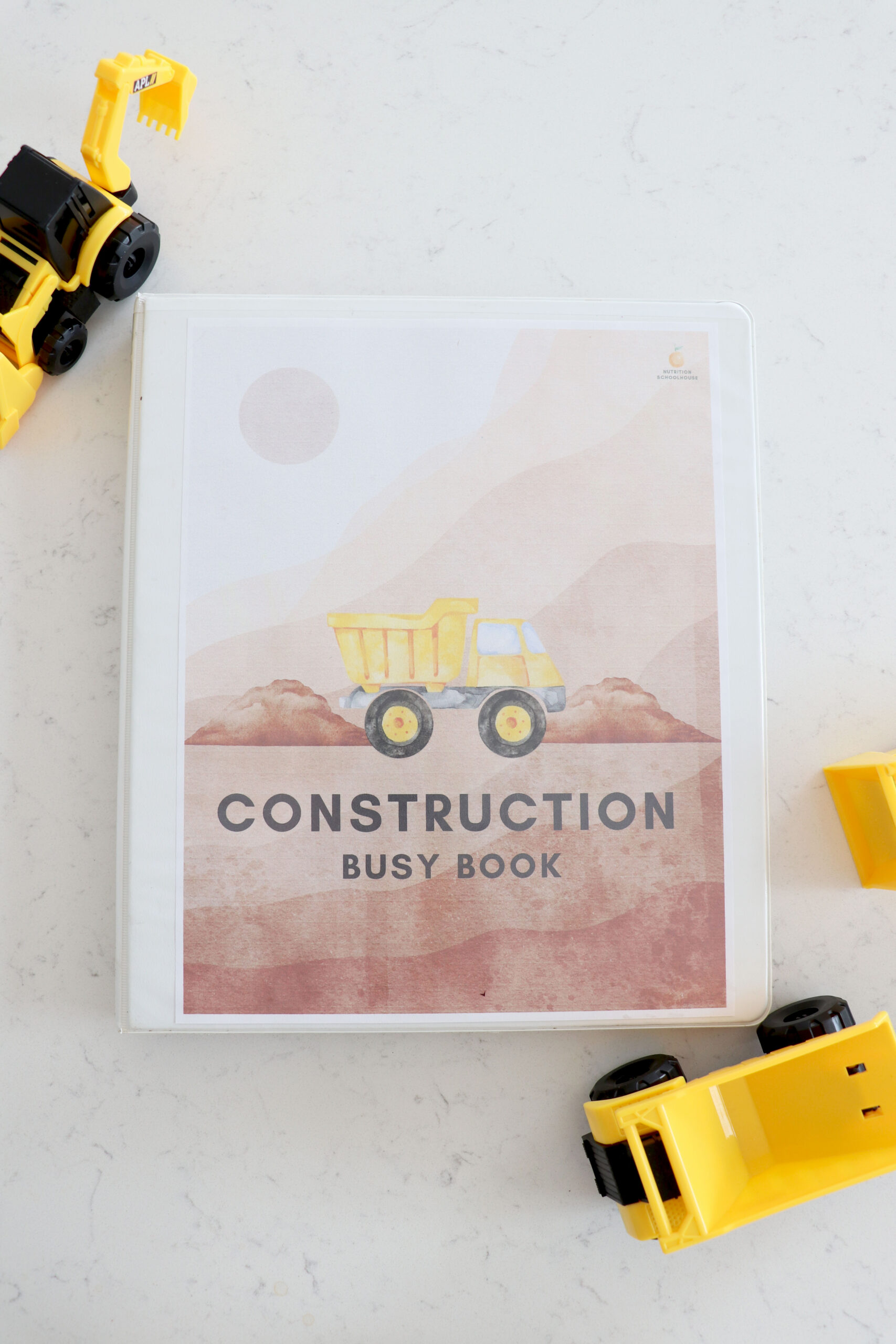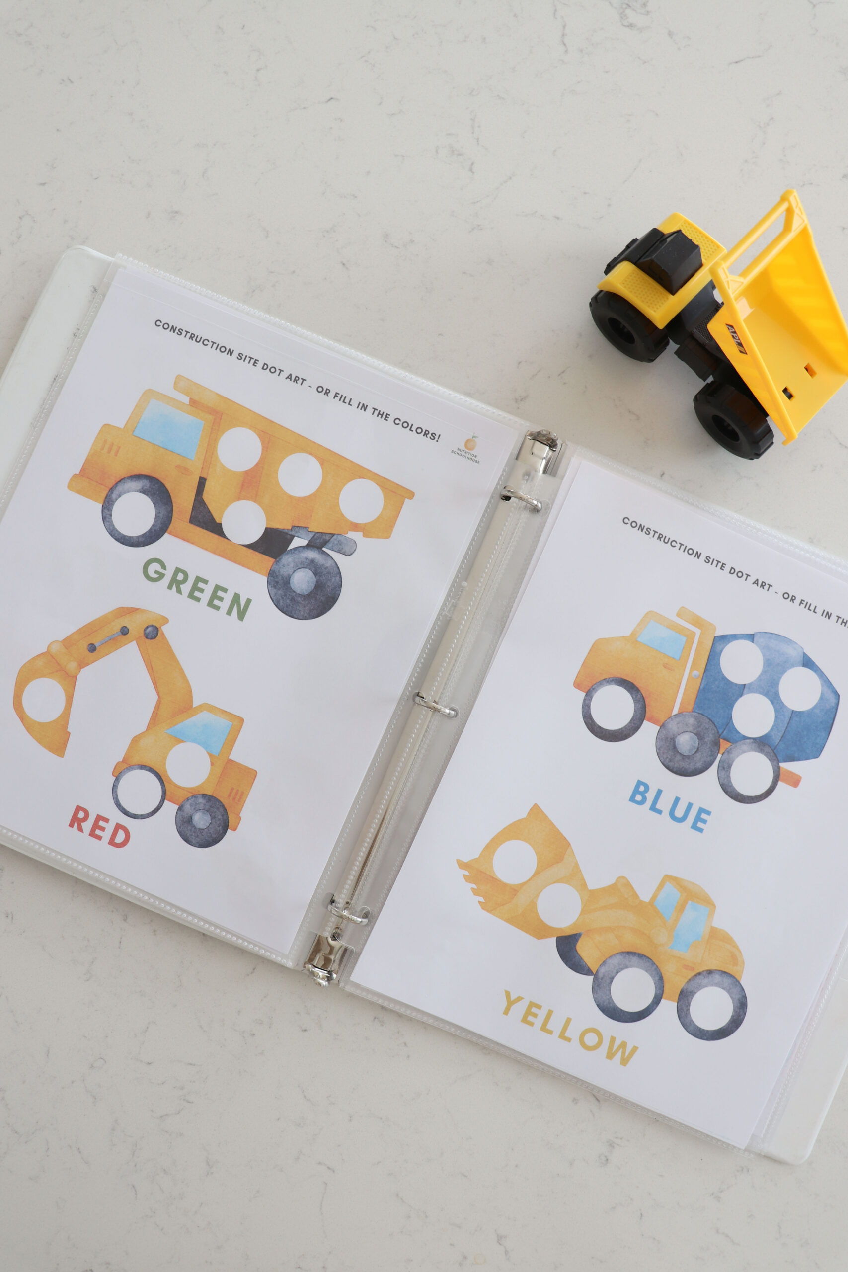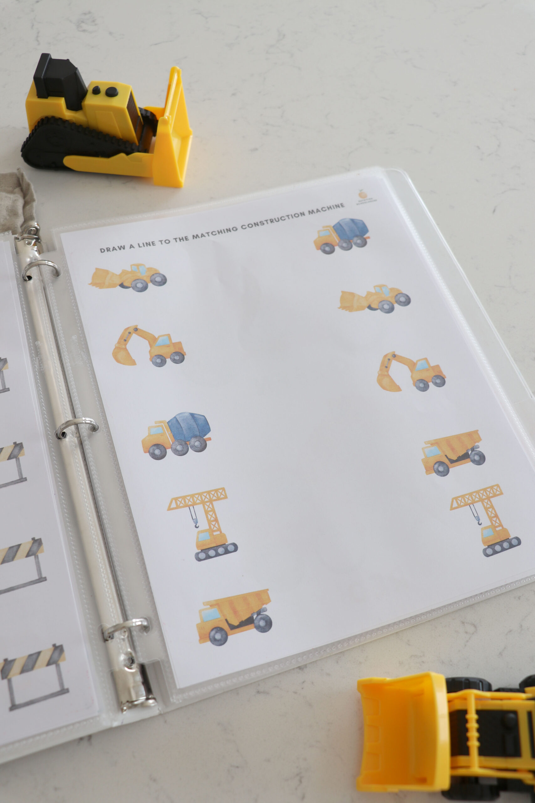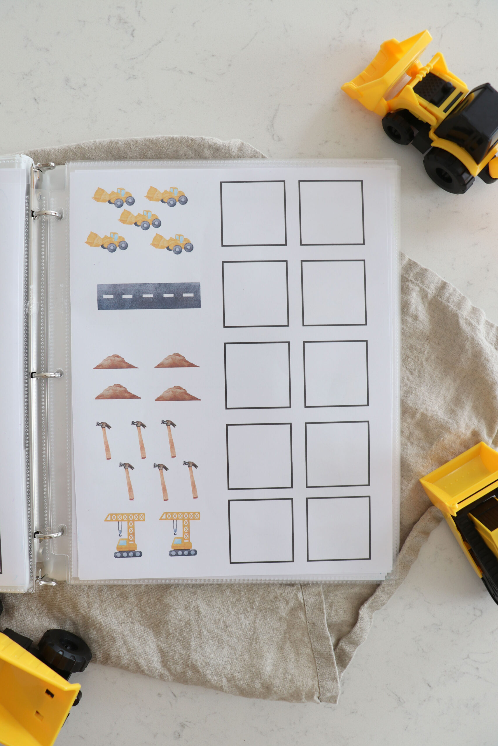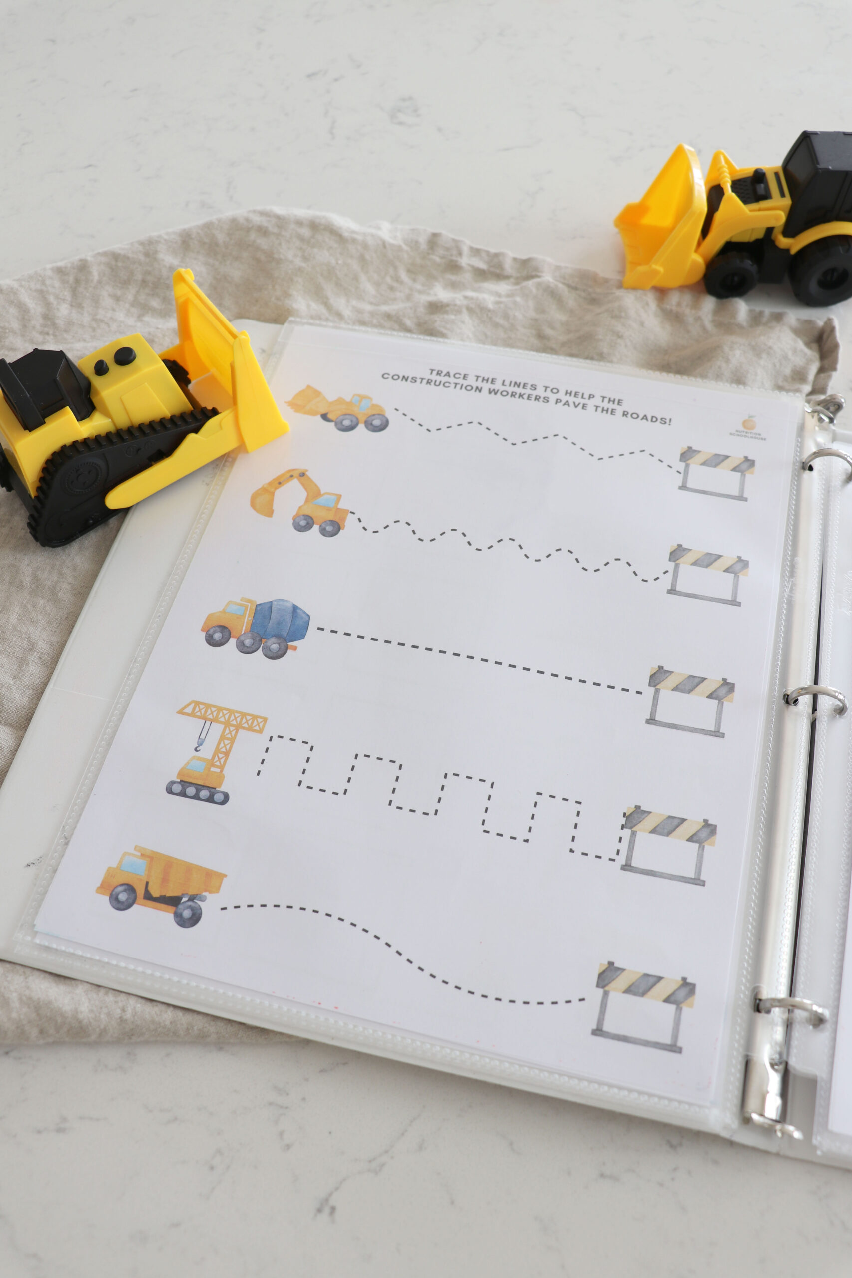 My son who is 3 years old, loves all things construction site! I made this busy book for him to enjoy while I do school with his older sister. He is LOVING it and I wanted to share with other families who have a construction site loving kid!