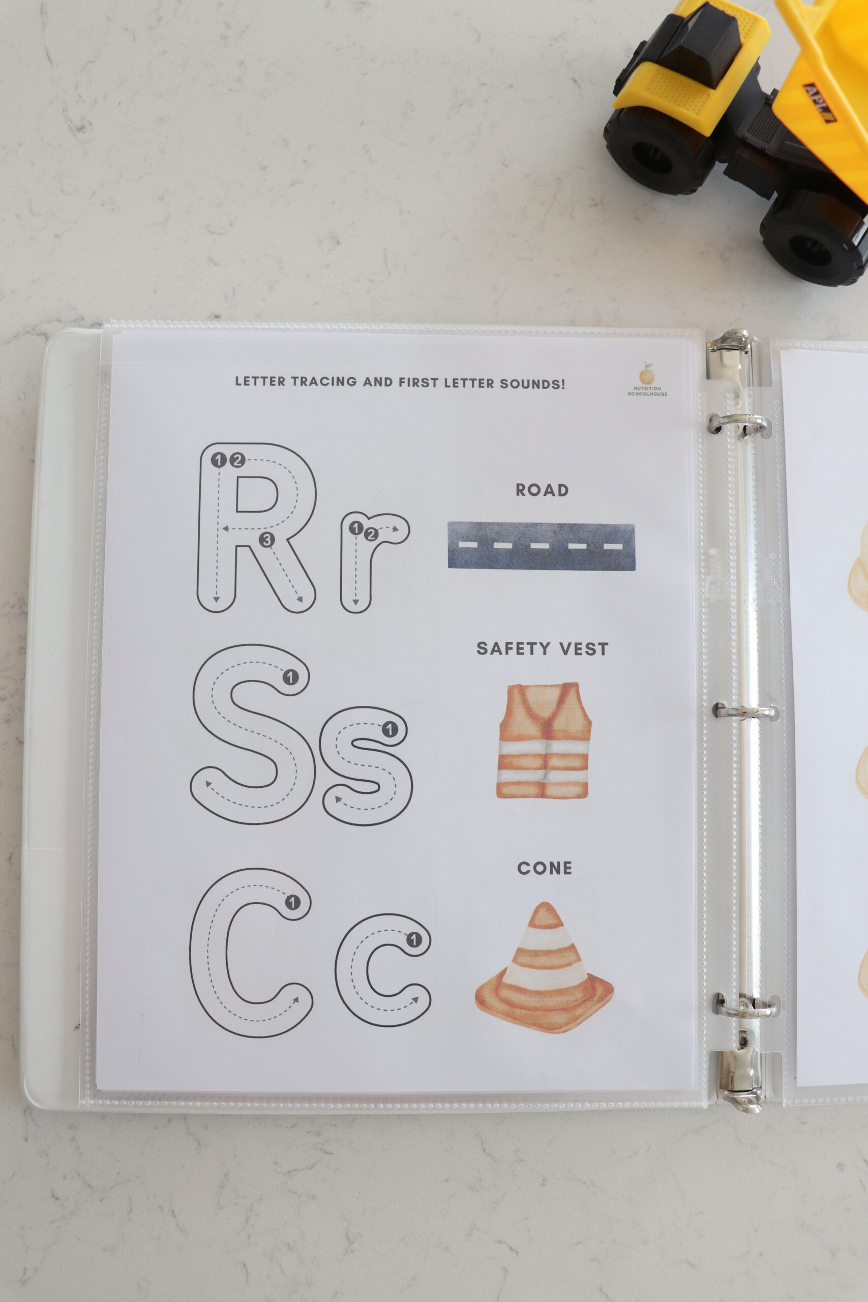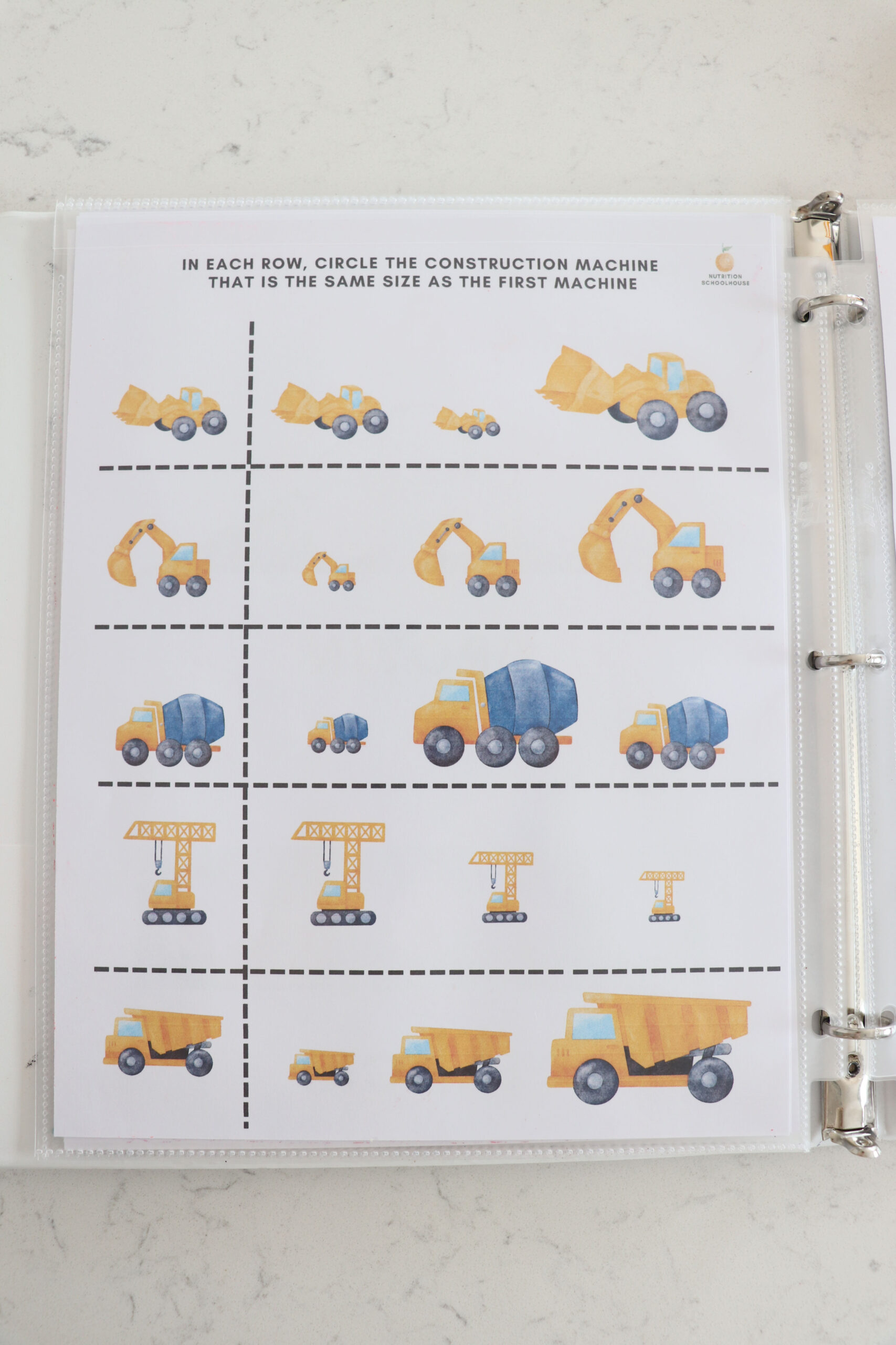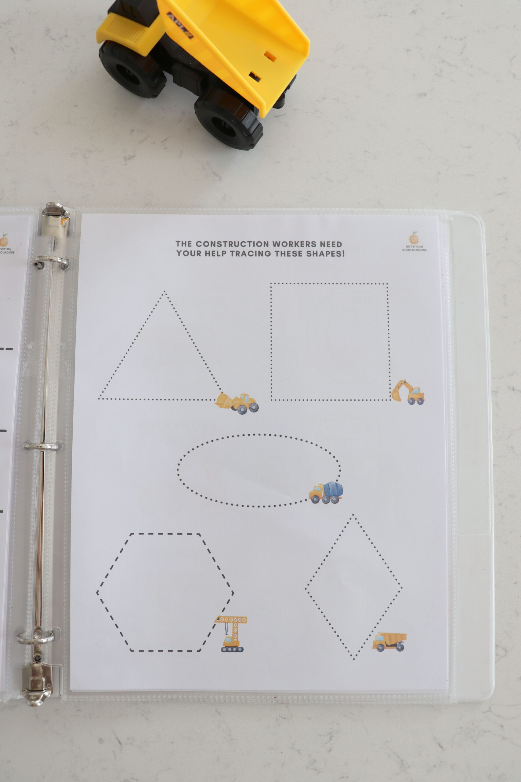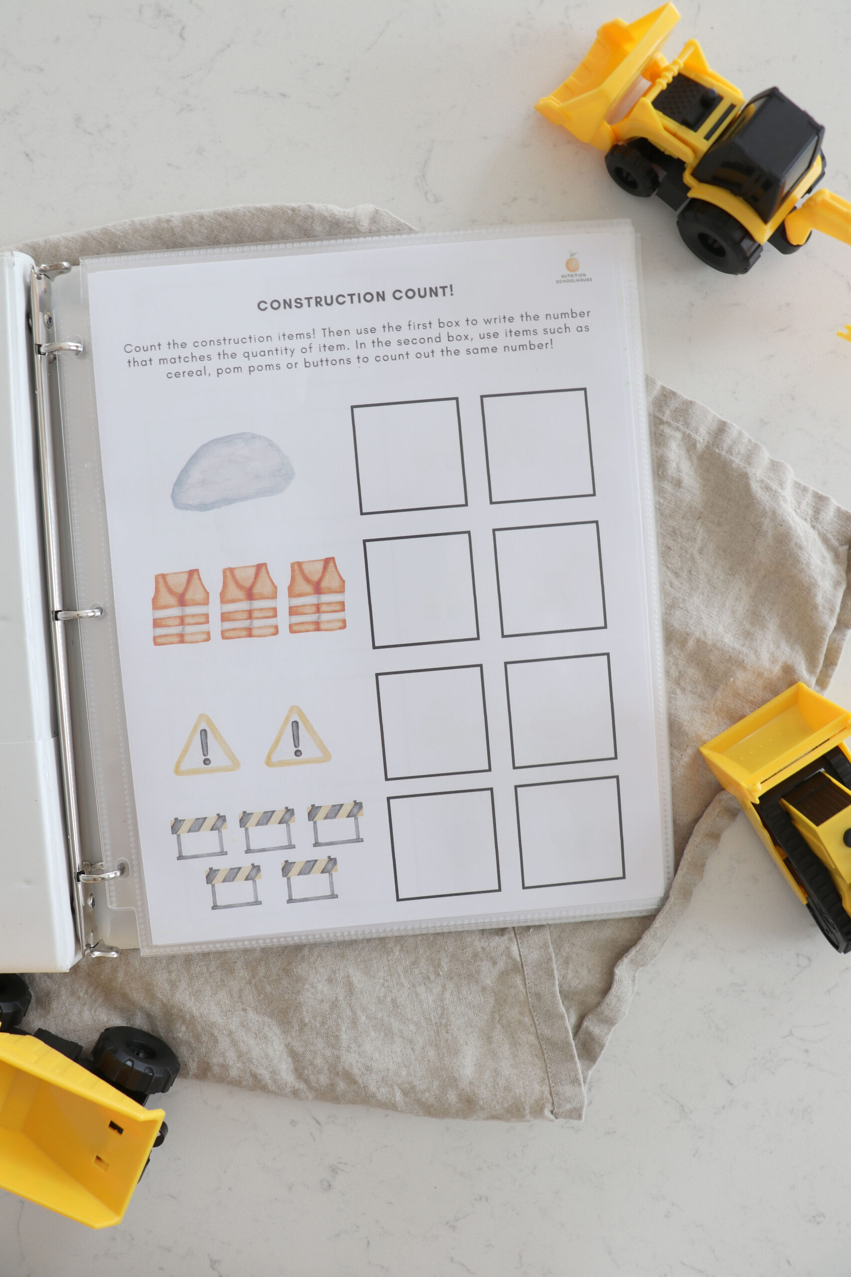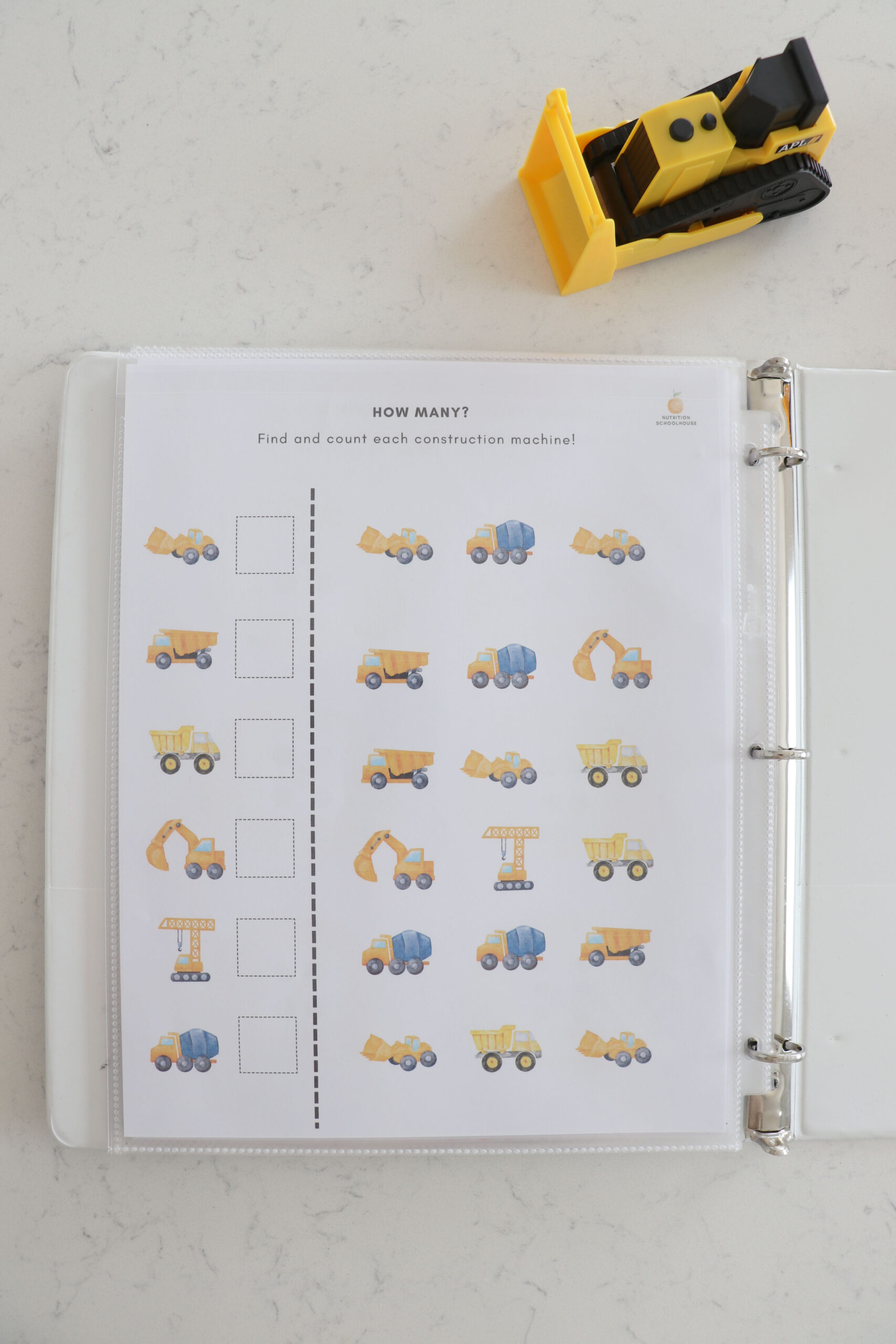 My son who is 3 years old, loves all things construction site! I made this busy book for him to enjoy while I do school with his older sister. He is LOVING it and I wanted to share with other families who have a construction site loving kid!
