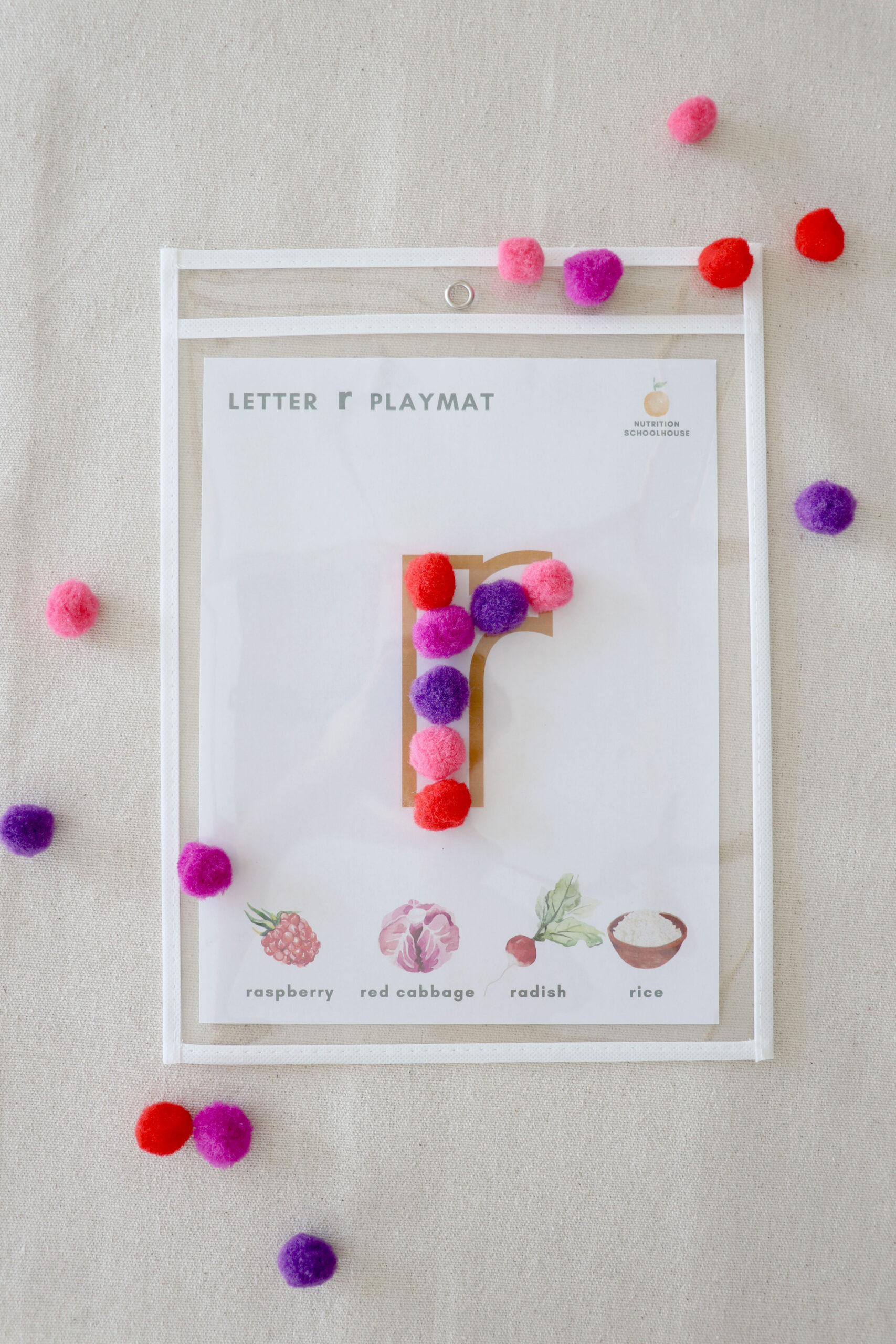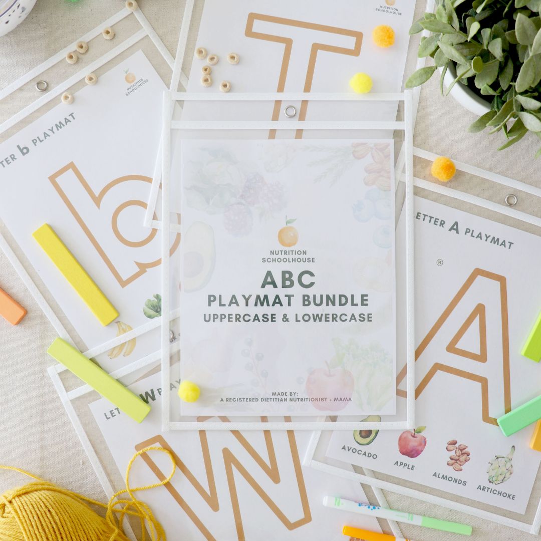 This Nutrition Schoolhouse pack includes 52 letter activity sheets, uppercase and lowercase. Each Playmat includes a large letter and then 4 fruits, veggies or other nourishing foods that start with the same letter! For example… A is for Avocado, Apple, Almonds and Artichoke! You’ll see food favorites and learn about new foods too!