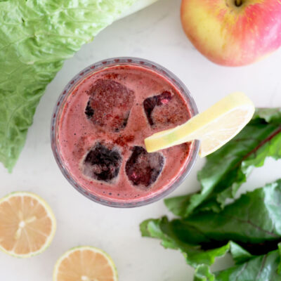 Glass with beet juice surrounded by lettuce, apple and sliced lemon.