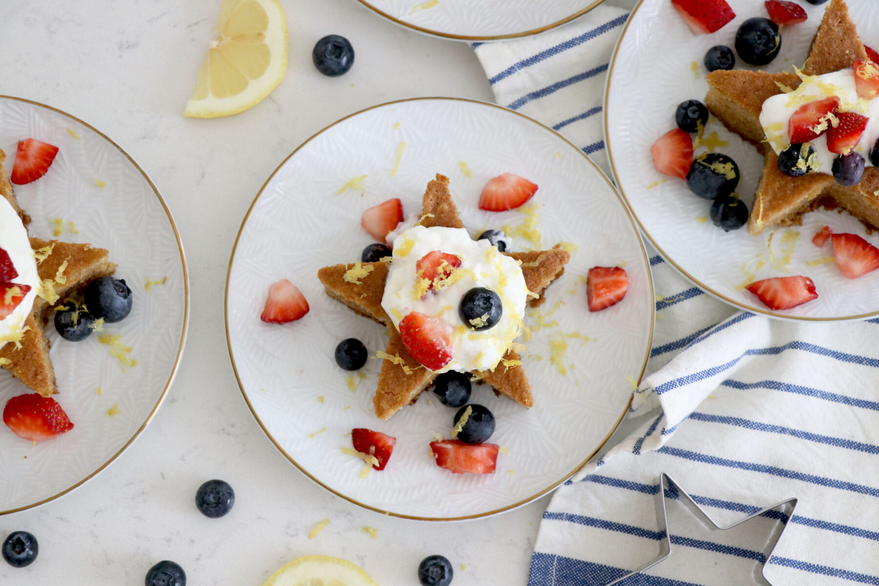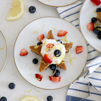 Using the star cookie cutter with the kiddos is a fun activity to do together! Once the cakes are finished baking, everyone can top them with their favorite yogurt and berries! Add some lemon zest for some extra zing and enjoy! This recipe will look beautiful on your table and is sure to be a crowd pleaser.