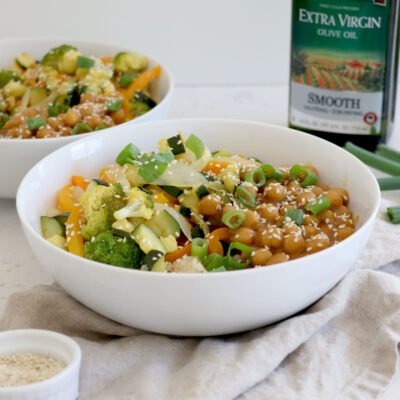- Serve the sautéed vegetables over rice with the orange ginger chickpeas, garnished with sesame seeds and green onion. Enjoy!