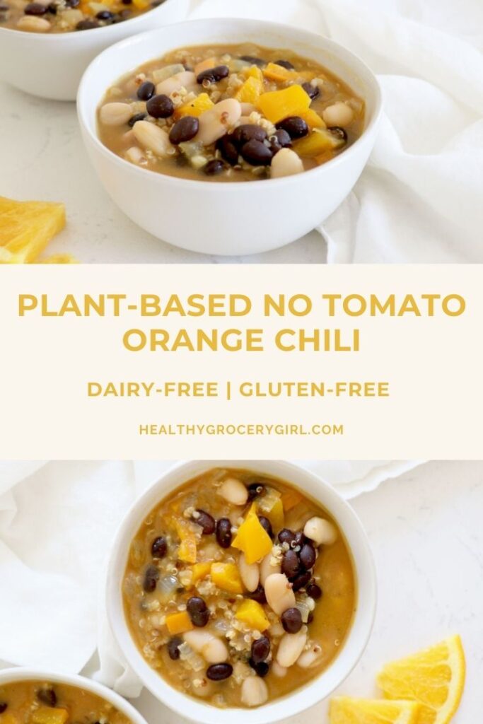 Looking for a cozy meal during those crisp fall nights?! This Plant-Based No Tomato Orange Chili is the perfect warming lunch or dinner you are looking for! I love chili, but sometimes I want an alternative to the traditional tomato based recipes. This recipe is a great option because it is made with sweet potato puree instead of tomatoes!