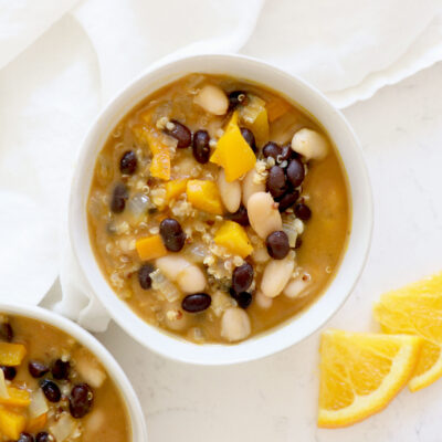 - Add quinoa into soup along with beans and orange juice. Stir to combine and let simmer for 5 minutes.