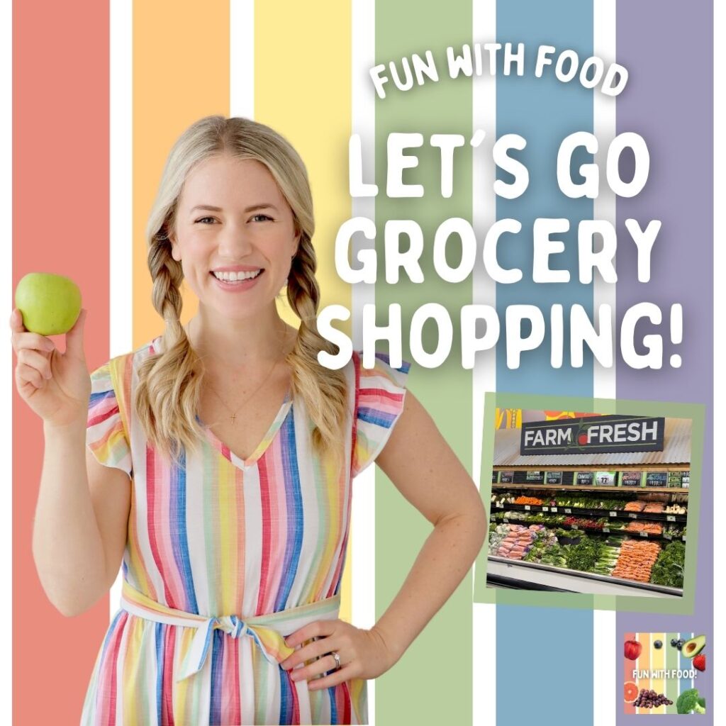 Today we’re celebrating episode 7 of Fun With Food with our very first FOOD ADVENTURE!! We’re going to the grocery store to learn all about grocery shopping, shapes, the letter G sound, colors, the health benefits of fruit and vegetables and more!!