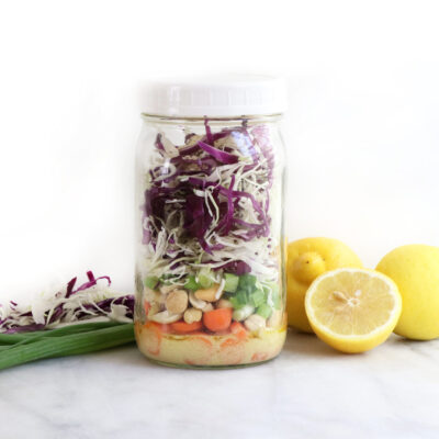- In a 32oz mason jar (or storage container of choice) add 3 tablespoons of dressing to the bottom of the jar.