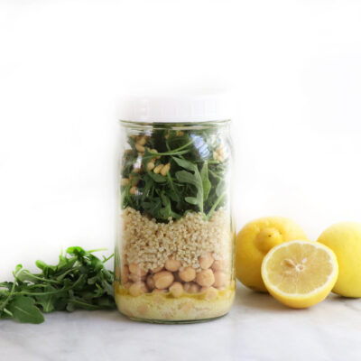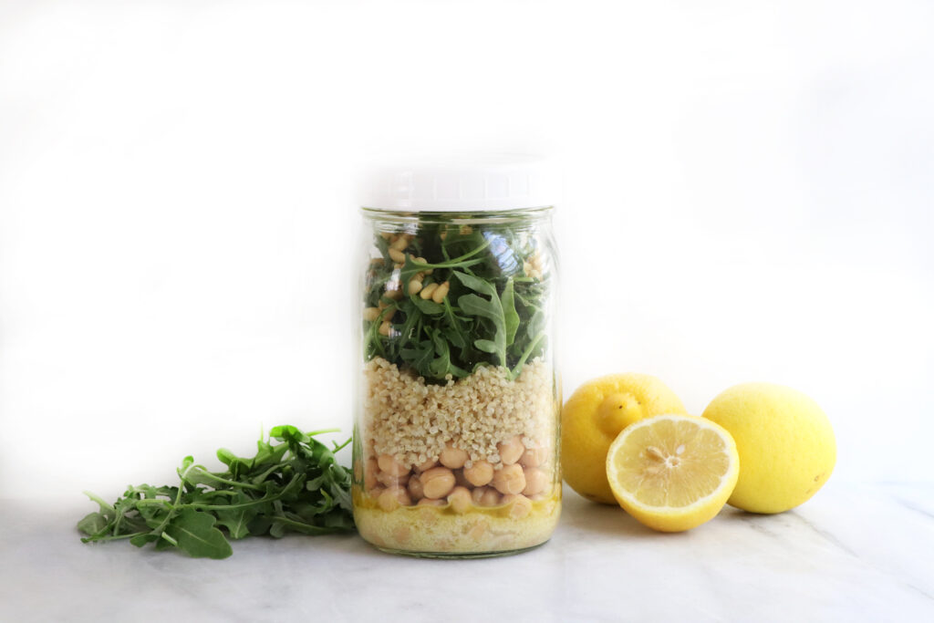 - Next, layer ingredients by chickpeas, quinoa, arugula, and pine nuts.