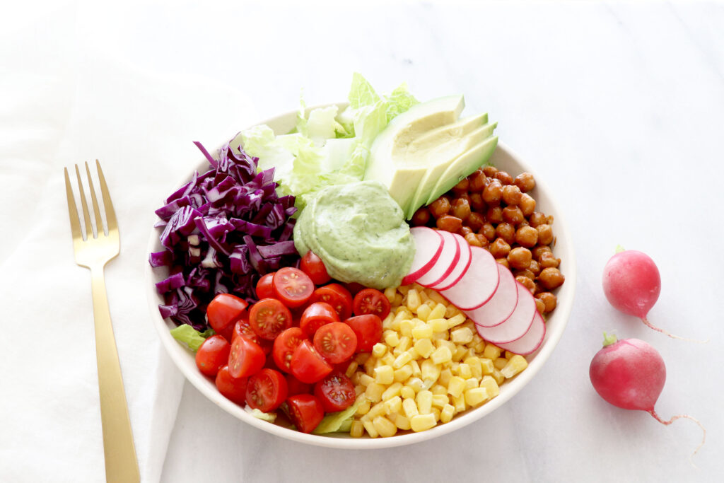 - Once the chickpeas are roasted toss them with a few tablespoons of the BBQ Sauce. Then build the salad; start with a bed of romaine and add the saucy chickpeas, sweet summer corn, diced purple cabbage, cherry tomatoes, sliced radish, a few slices of avocado and finally a big spoonful of the avocado ranch dressing, enjoy!