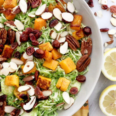 A salad full of our favorite Thanksgiving flavors is the perfect healthy side for the family! We are excited to share this Brussels Sprouts Butternut Salad that is packed with filling fiber and whipped up with a super easy homemade dressing!