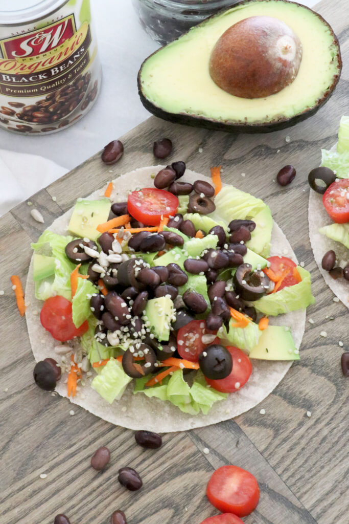 - Then top with romaine (washed and chopped), olives, shredded carrots, black beans, a pinch of sea salt and optional sunflowers and / or hemp seeds!