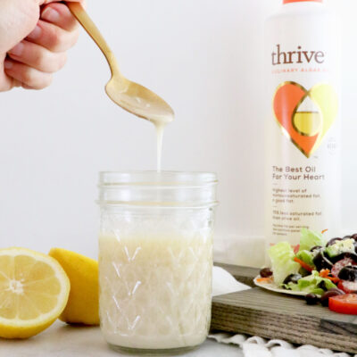 One of my favorite oils to use when making salad dressing is Thrive® Algae Oil! Thrive® Algae Oil is an everyday cooking oil made from algae that’s a delicious and easy way to get more good fat in your diet. This oil has the highest level of monounsaturated fat – the good, heat stable fat – than any other cooking oil and lowest levels of saturated fat than any cooking oil. Thrive® also has a light, neutral taste, which lets the natural flavors of your food shine through. Another benefit of algae oil is that it doesn’t solidfy when stored in the fridge, which is common for many oils. So it’s perfect for prepping and storing homemade dressings and sauces in the fridge.