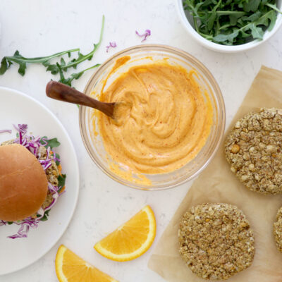 Summer is here, which means more fun in the sun and incredible burger recipes to eat outside! This Orange Buffalo Chickpea Burger recipe is packed with plant-based protein, fiber and healthy fats! It is topped with a spicy and tangy buffalo sauce and crunchy cabbage. Yum!