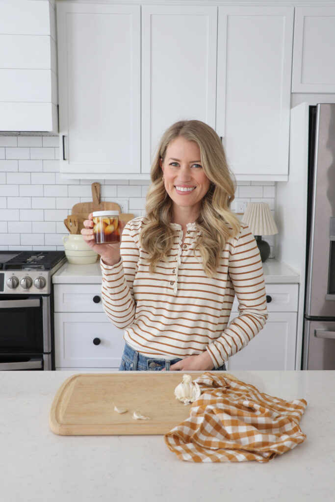 First, peel garlic cloves from the garlic bulb. The exact amount does not matter however I aim to have about 1 cup of garlic cloves. Add the garlic cloves to a small glass jar and top with 1 teaspoon of apple cider vinegar, commonly referred to as ACV. This step is completely optional, however it can provide peace of mind for those we are worried about botulism related to honey and the bacteria growth that occurs during the fermentation process. It is very unlikely that botulism would grow with this recipe. However, for peace of mind you can add 1 teaspoon of apple cider vinegar which will improve the pH making the environment unfavorable for botulism. In addition, never feed honey or fermented honey garlic to babies ages one year old and younger. Fill the jar with raw local honey that has not been pasteurized leaving a small bit of room at the top, as during the fermentation process the honey will bubble. Pasteurized honey is highly processed and during the pasteurization process, key health benefits and nutrients of honey are lost. When you buy and consume raw honey you ensure that the amazing health benefits of honey are intake. Add a lid and place in a cool dark place such as the pantry. I like to add to a small bowl under the jar as the honey can bubble over and spill out as it starts to ferment. Every day secure the lid on tight and rotate a few times to ensure the garlic is fully coated with honey. Then slightly loosen the lid once it’s upright again. Continue this pattern for one month and then enjoy! You can technically eat the garlic or honey at any time during the month. However, waiting the full month will ensure a truly potent fermented honey garlic. Enjoy!