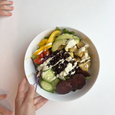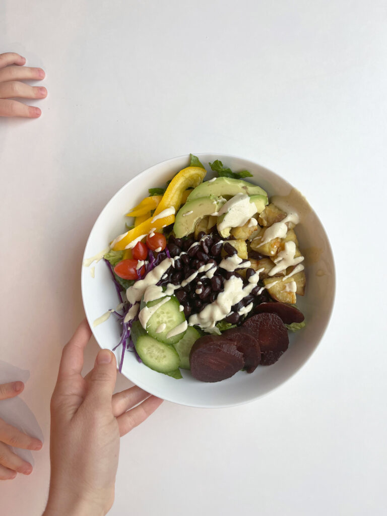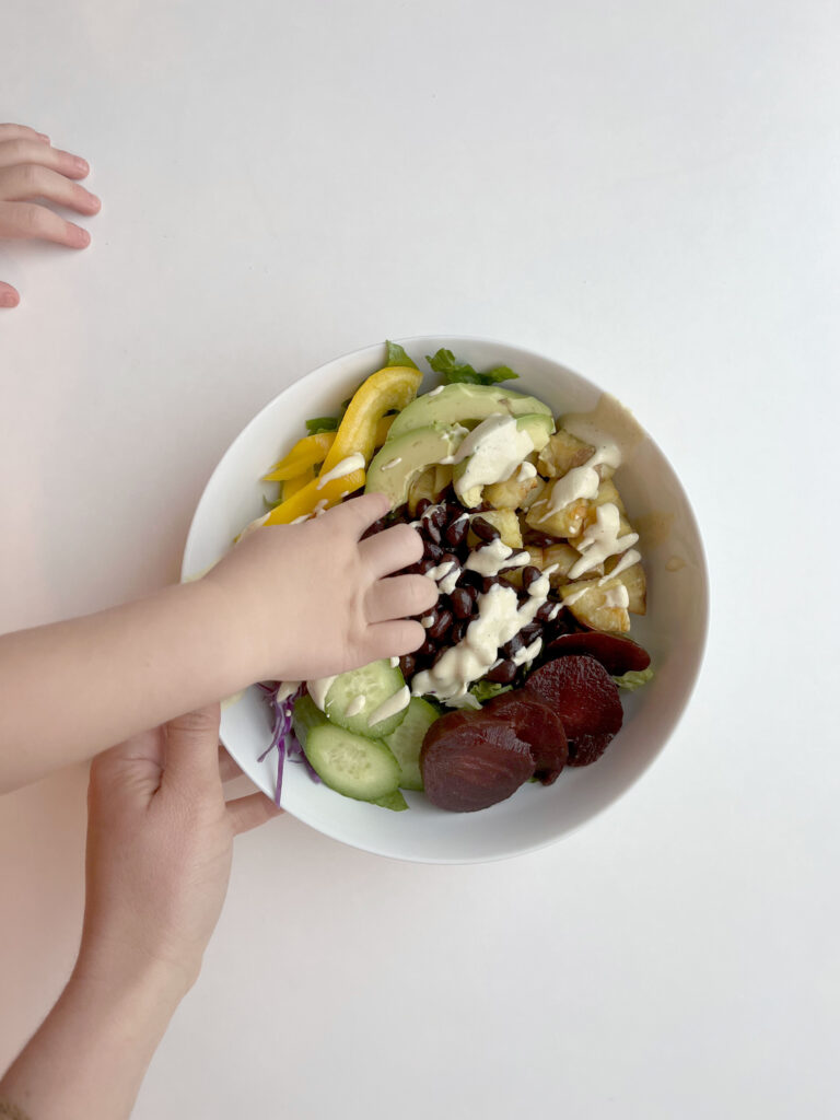My kids eat the same dinners that we do, however, I’ll offer the dinner in a different way. For example from this meal on a plate I added black beans, potatoes, yellow bell pepper, avocado and then a little salad with the dressing my kids prefer. Both my kids like the ingredients separated versus in a big bowl, so they enjoy a deconstructed version of this power bowl!