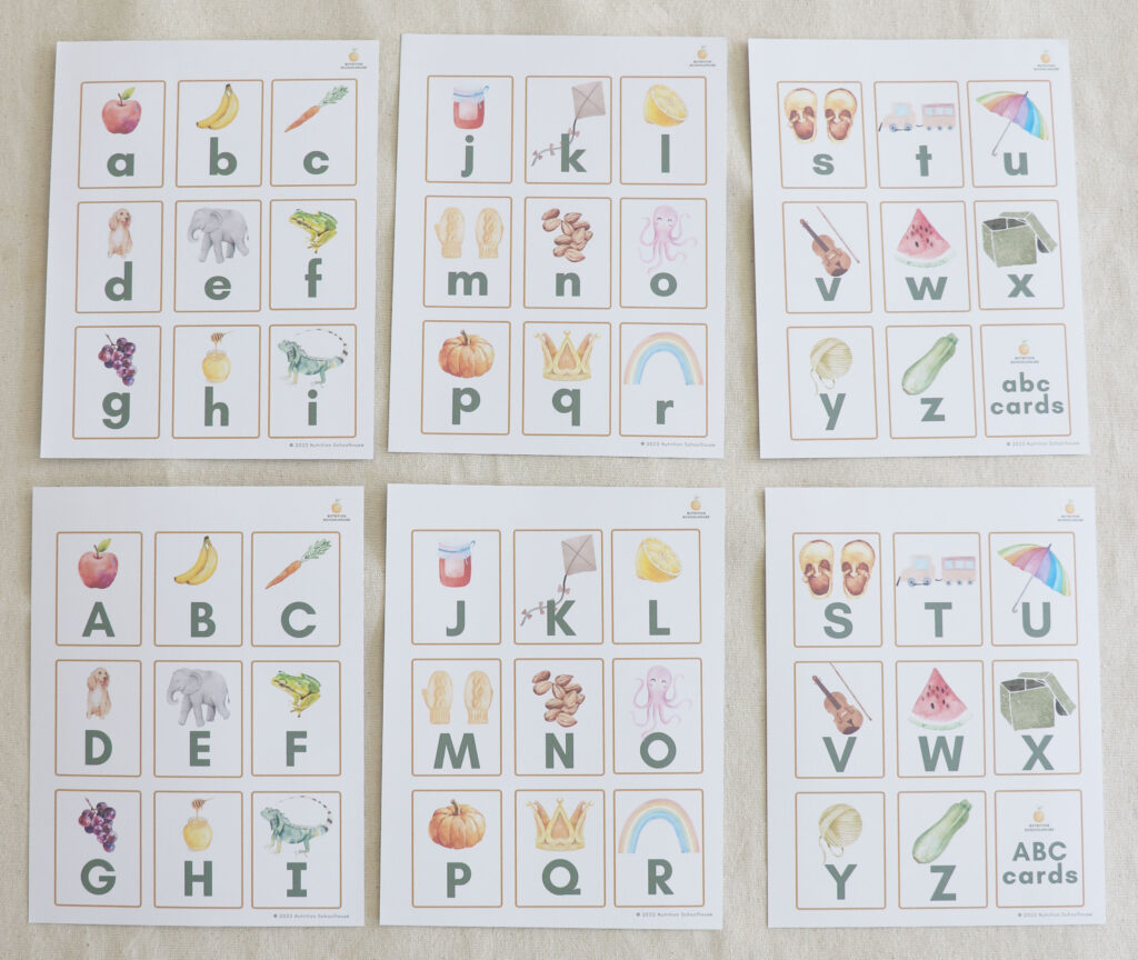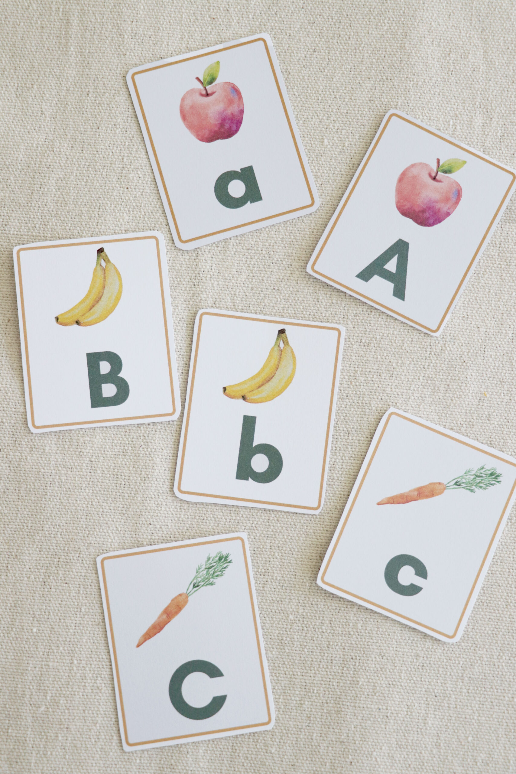 Each uppercase and lowercase letter has a matching image. For example the image of an apple on both the uppercase A and lowercase a card or an image of bananas on the uppercase B and lowercase b card. The image repetition is helpful for matching games.