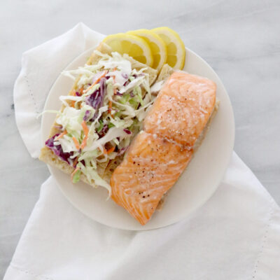 Friends! Summer is in full swing and we are excited to share with you a new lunch recipe! Today we are making a Salmon Sandwich with a Coconut Citrus Slaw that is perfect for any occasion! This sandwich is packed with protein, fiber, vitamin C and healthy omega-3 fatty acids!