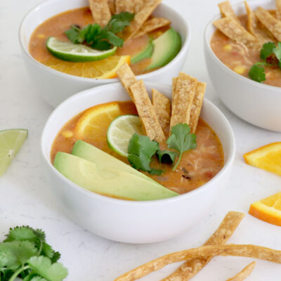 It’s October, which means cooler nights and warm comforting meals! I can’t wait to share with you this flavorful and healthy Citrus Chicken Nacho Soup! This soup can be made in less than 30 minutes making it the perfect weeknight meal to satisfy the entire family! Made with fresh and protein packed ingredients such as black beans and chicken, so no one will be left hungry.