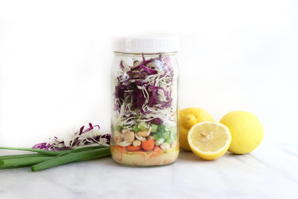 - In a 32oz mason jar (or storage container of choice) add 3 tablespoons of dressing to the bottom of the jar.