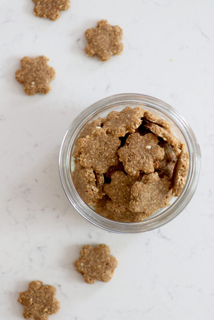 I love making these easy homemade dog treats for our dog Ruby. They are made with just 4 simple ingredients; oats, peanut butter, banana and water.