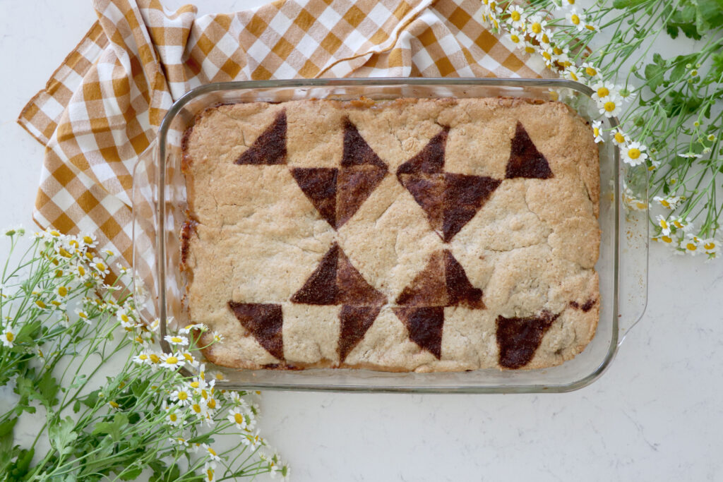 - To make your quilt stencil… design your quilt pattern on a piece of parchment paper and use a (clean) x-acto knife to cut out the shapes / triangles. Press the parchment paper on top of the cobbler gently. In a bowl mix together cinnamon and sugar and sprinkle on top of parchment paper patting in with your fingers the open spaces to fully fill the design. Carefully remove parchment paper.