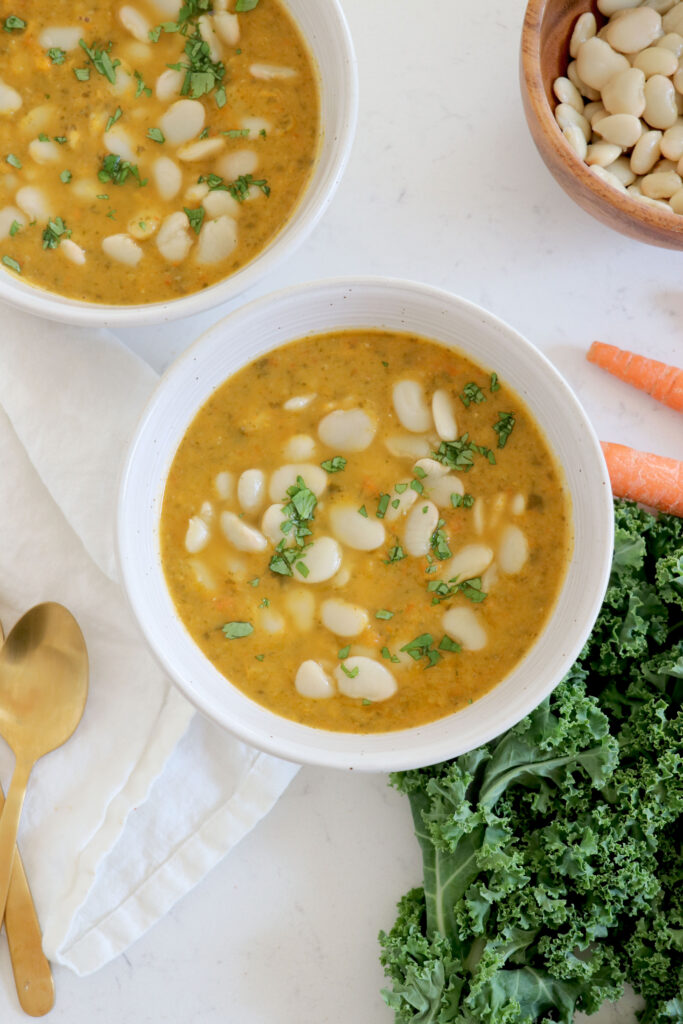 First, peel and chop sweet potatoes and carrots. Rinse, core and dice the red bell pepper and rinse, devein and chop the kale. Warm the coconut oil over medium heat in a large soup pot. Add the bell pepper, carrot, sweet potato and kale then sauté for 3 mins. Add the spices and sauté for another 2 minutes. Add the water, bring to a boil then lower the heat and simmer for 15 minutes. Add two cans of butter beans, drained and rinse, then use an immersion blender to blend most of the soup. If you do not have an immersion blender you can add the soup to a high-speed blender and blend together. Blend the soup more or less depending on your preference. I like to blend most of it, but leave some whole veggies for texture. Finally add the remaining can of butter beans (drained & rinsed). Keep on medium/low heat for 5 minutes to heat through. Serve topped with parsley or cilantro, and enjoy!